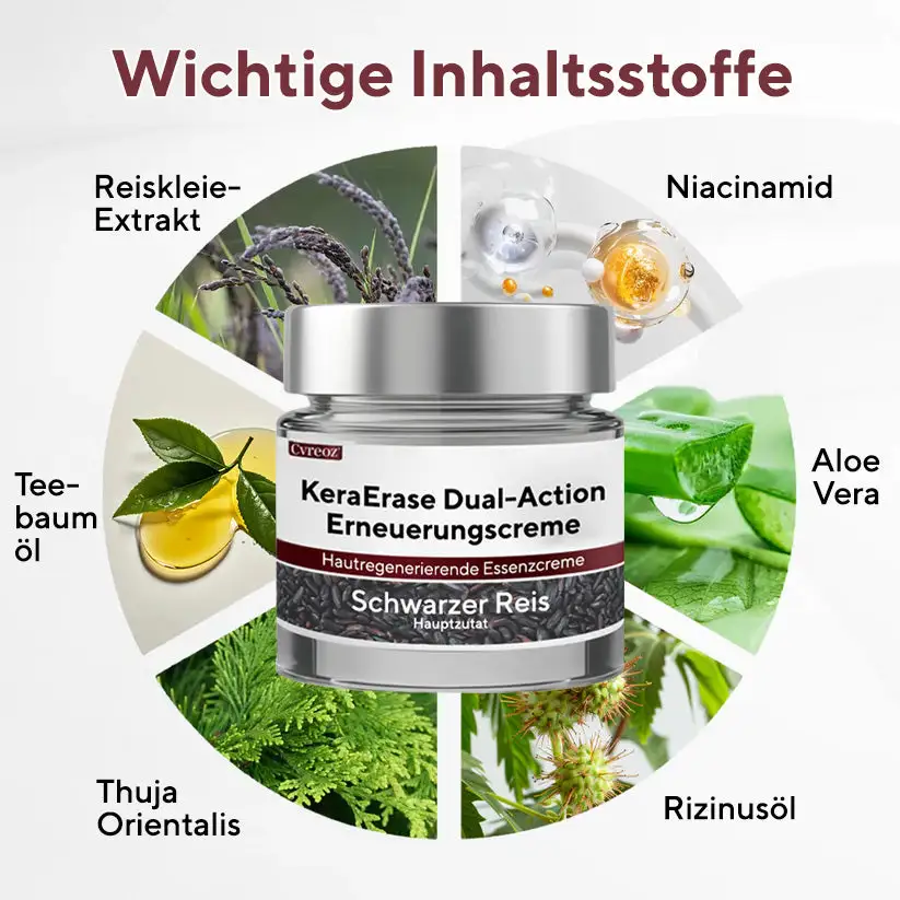 Deshalb haben wir die Cvreoz® KeraErase Dual-Action Erneuerungscreme entwickelt – eine sanfte, pflanzenbasierte Formel, die Unebenheiten glättet, tiefe Hornhautablagerungen löst und hartnäckige Pigmentflecken aufhellt. Und das ganz ohne aggressive Säuren, Brennen, Schälen oder Reizungen.